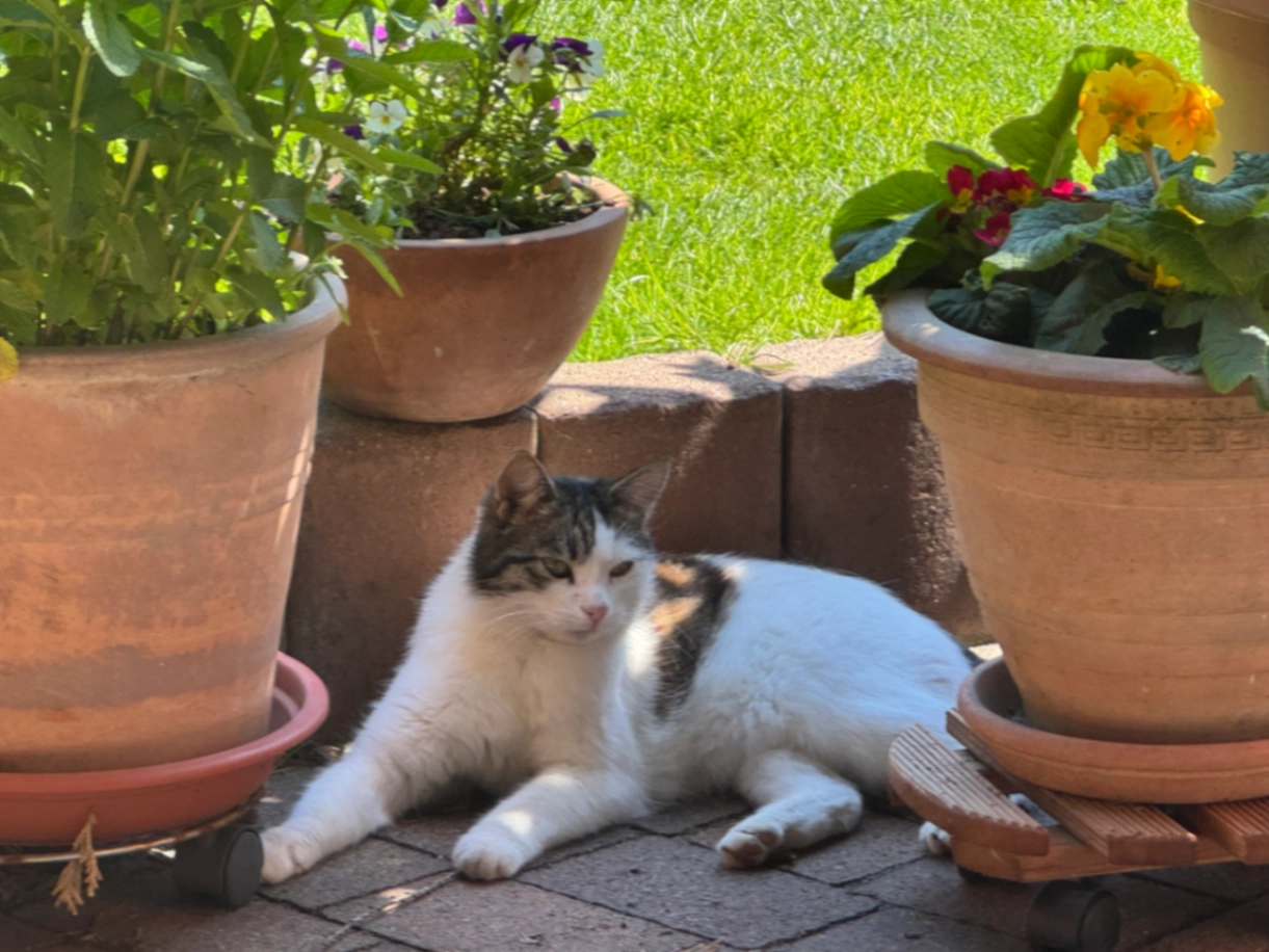 Theo ist ein kastrierter Kater. Er besitzt einen Chip, liegt gerne viel rum und lässt sich wahrscheinlich nicht von Fremden streicheln. Er hat kürzeres schwarz und weißes Fell, mit vielen vereinzelten weißen Haaren in den schwarzen Bereichen. Die von der Person aus gesehene rechte Seite der Nase hat etwas weniger Fell da er eine Krankheit hat. Er ist dünn gebaut und etwas kleiner als normale Katzen.