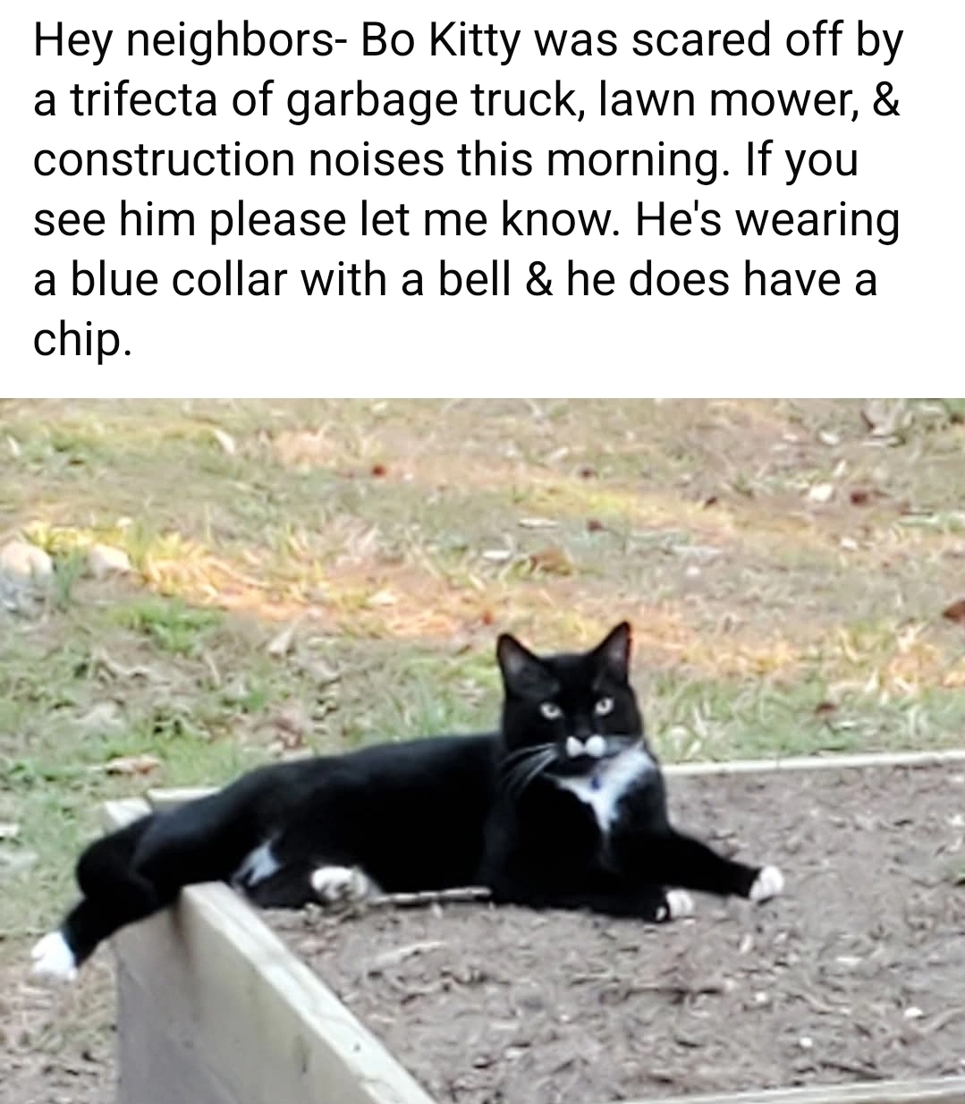 Bo Kitty is a large male tuxedo cat. He has a white bow tie mustache. He's wearing a blue collar with a bell & he does have a chip.