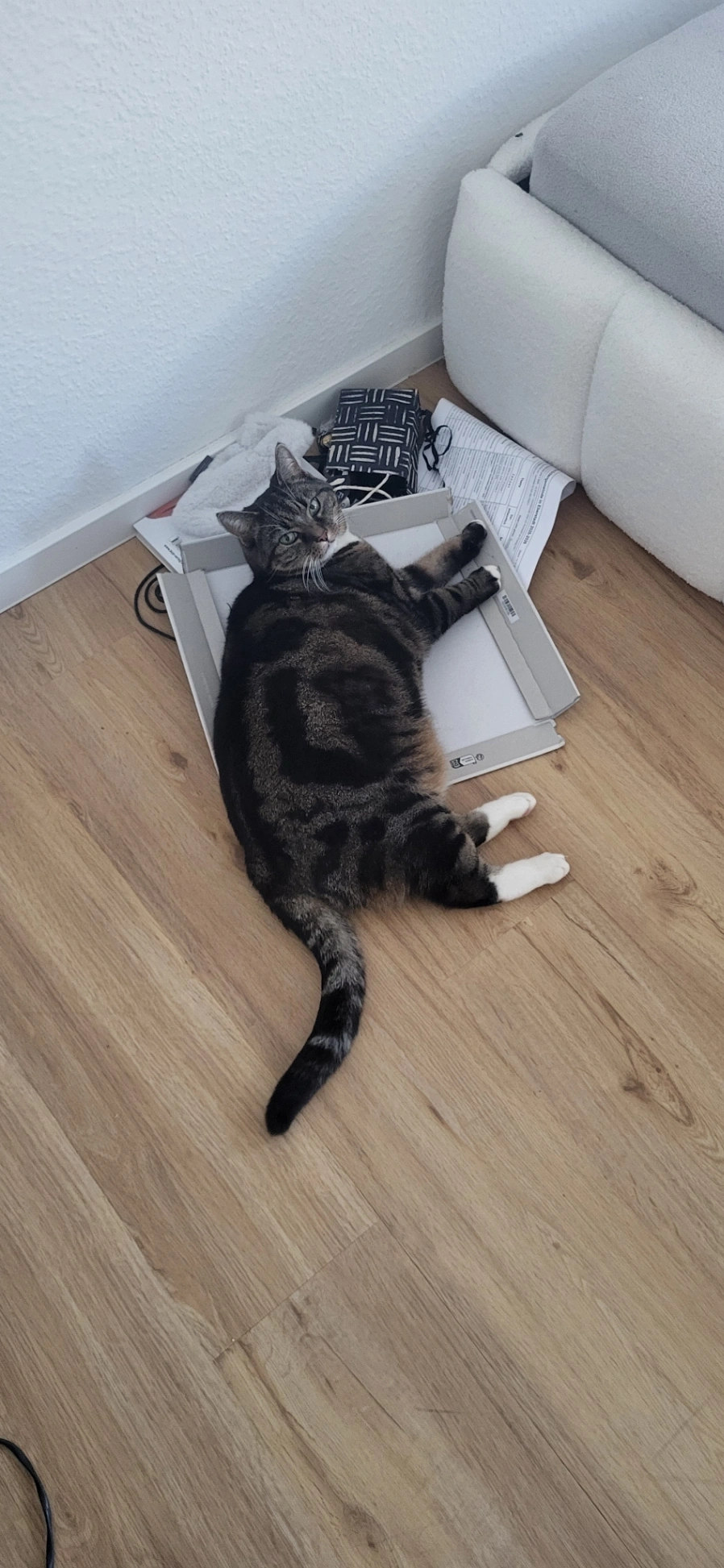 Grau weiss schwarz getiegert mit weissem Lätzchen und grünen Augen und weißen Pfoten