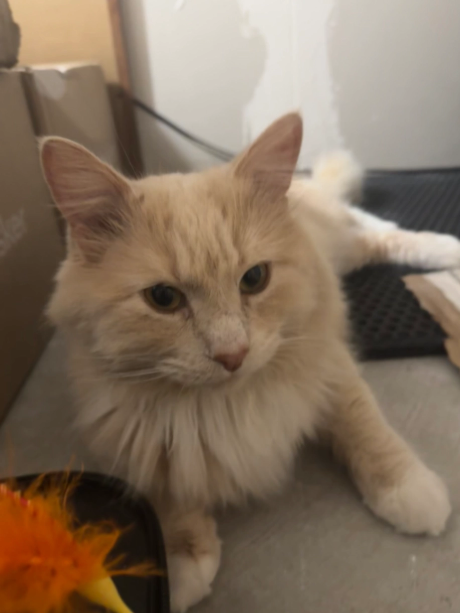 Fluffy cat, medium size, golden color. Bald spot on neck.